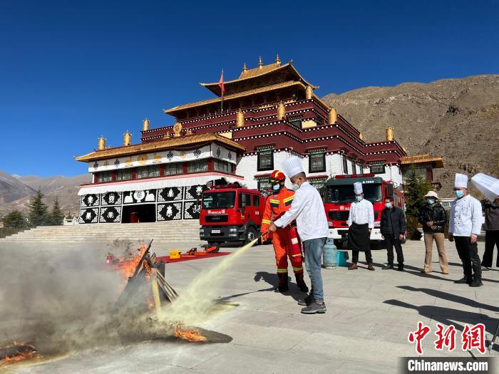 圖為(wei) 消防員在寺廟桑龍日追向出家人宣傳(chuan) 講解消防知識。 拉薩市消防救援支隊供圖