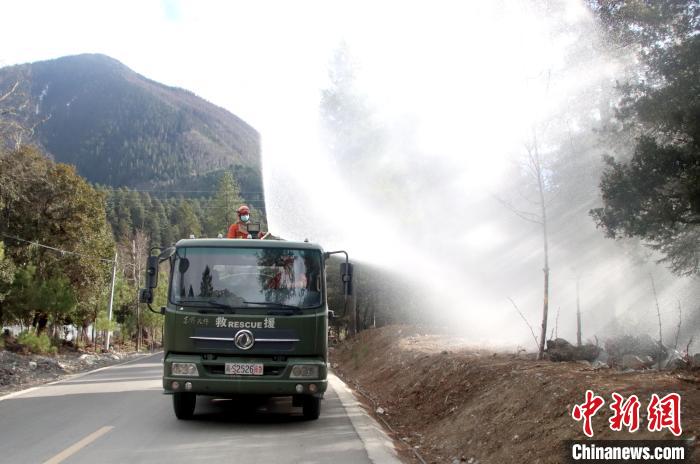 消防隊員進行灑水增濕作業(ye) 。 王澤棟 攝