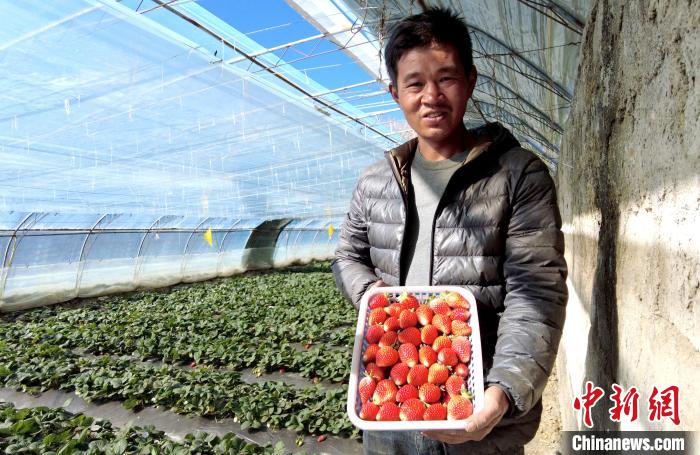 11月25日,西藏拉薩林周縣卡優(you) 村果農(nong) 展示剛剛收獲的草莓。 李林 攝