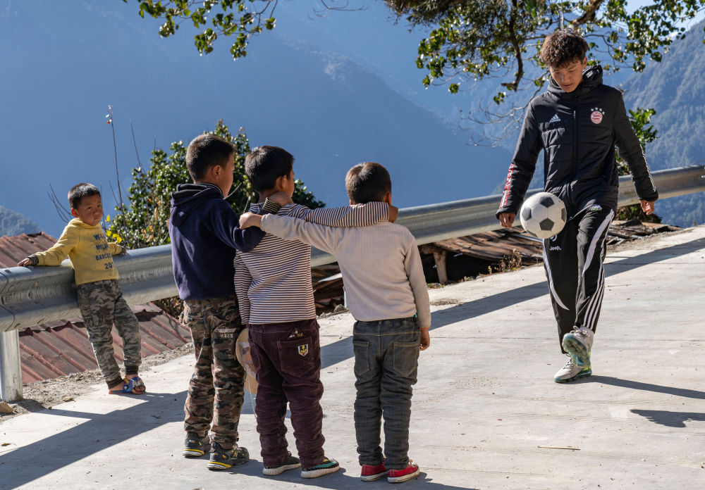 在西藏林芝市墨脫縣德興(xing) 鄉(xiang) 巴登則村,旺前羅布向弟弟們(men) 展示自己的球技(2021年2月9日攝)。新華社記者 孫非 攝