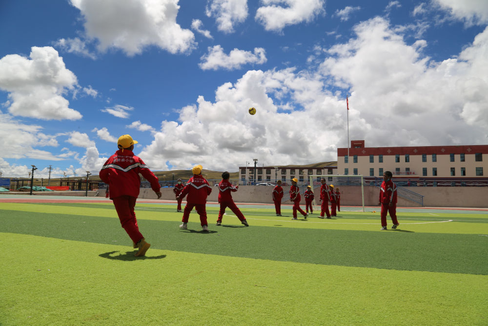 西藏那曲市聶榮縣小學的學生們(men) 在踢足球(4月20日攝)。新華社發(大巴次 攝)