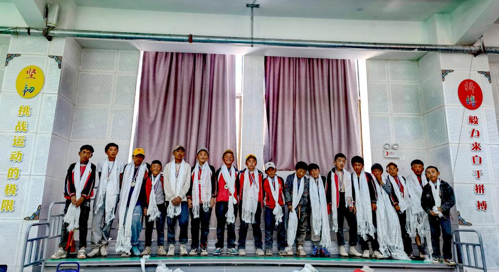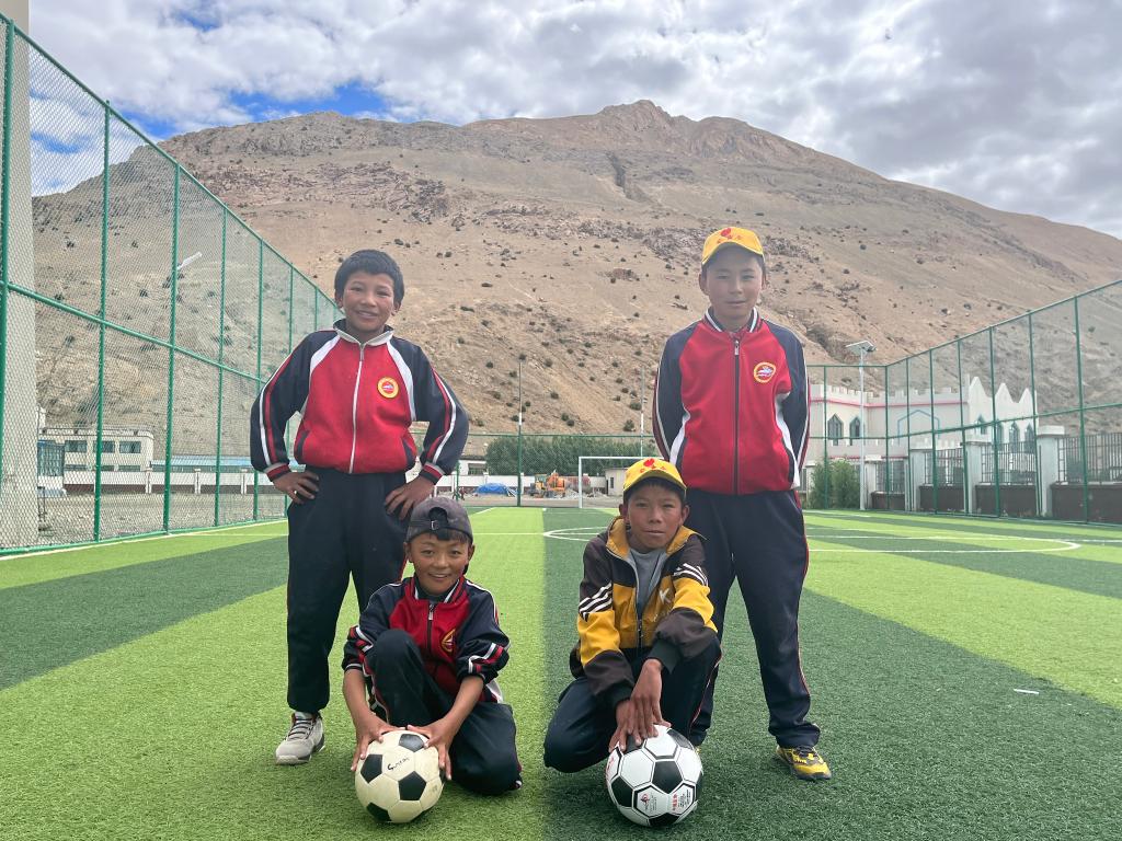 今年6月畢業(ye) 前夕,格旦曲桑(前左)和同學在紮西宗鄉(xiang) 完全小學的足球場上合影留念