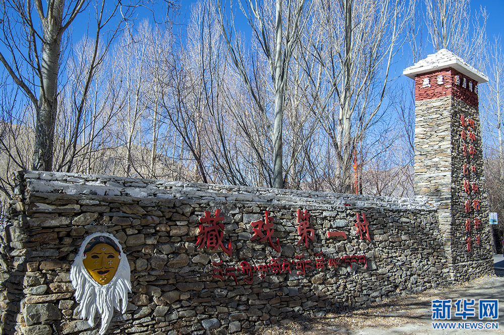 圖為(wei) 紮西曲登社區大門旁的雅礱紮西雪巴藏戲麵具和標語(12月9日攝)。新華網 旦增努布 攝