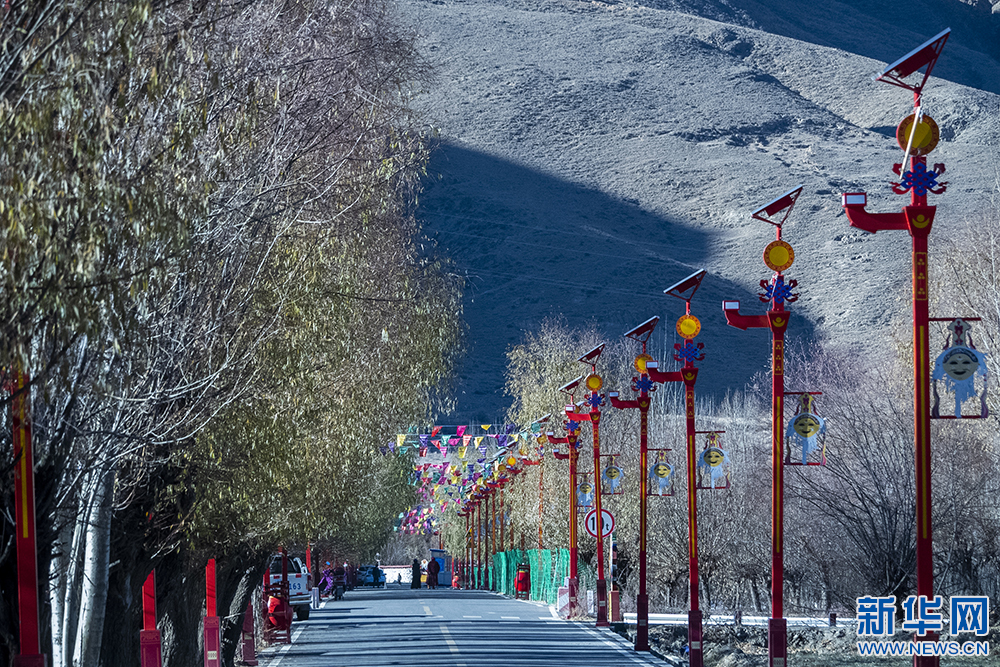 圖為(wei) 紮西曲登社區街邊的藏戲主題路燈(12月9日攝)。新華網 旦增努布 攝