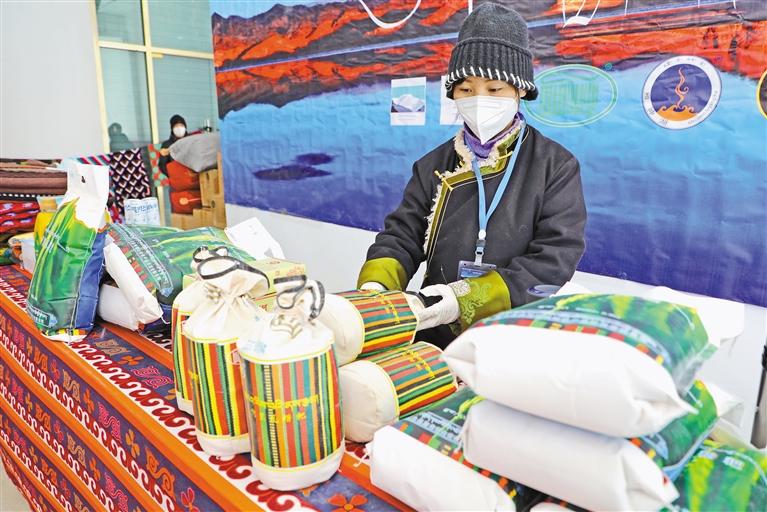 在日土縣展銷區,工作人員在擺放特色產(chan) 品。記者 永青 攝
