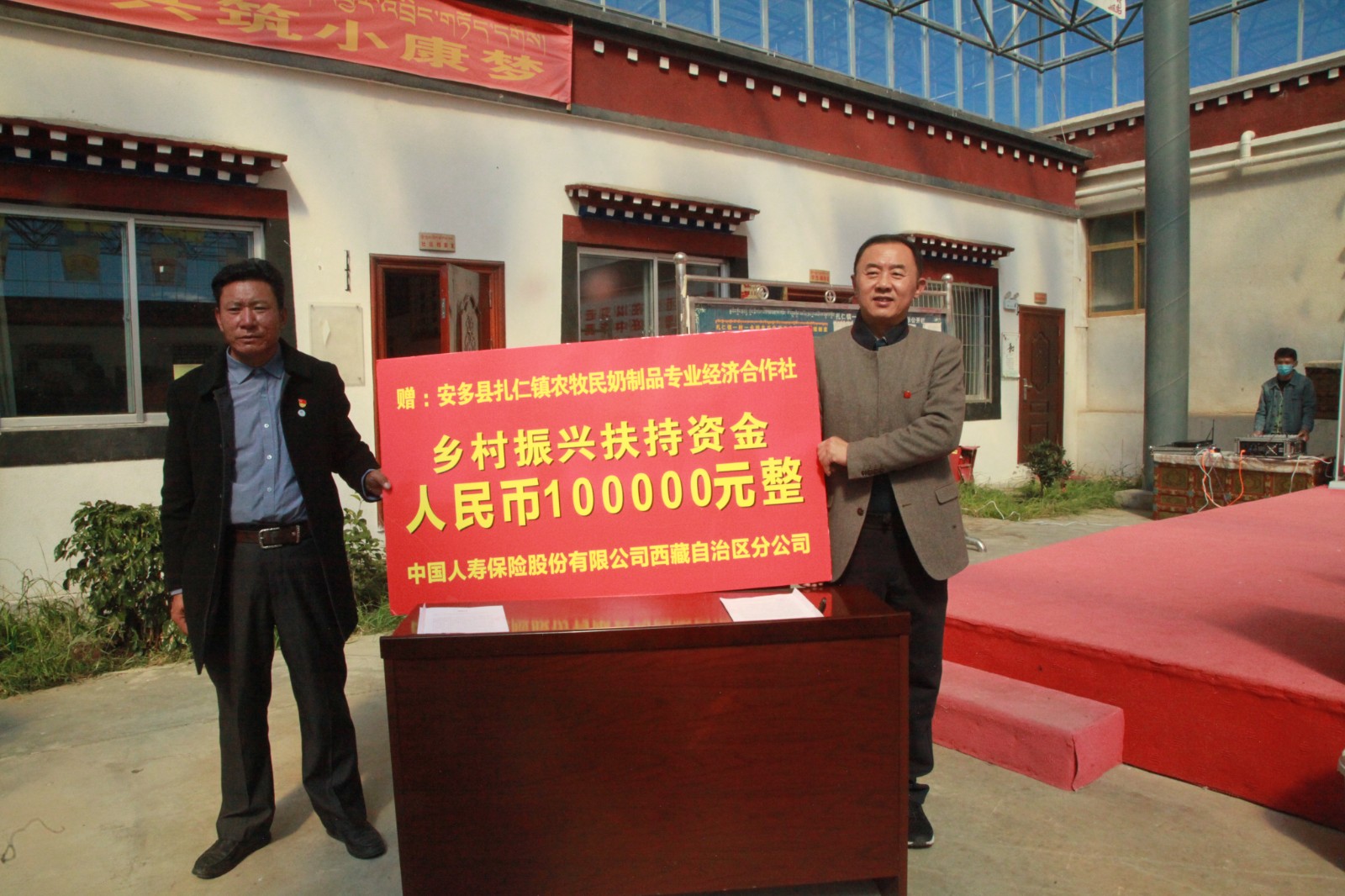圖為(wei) 中國人壽西藏分公司向那曲市安多縣紮仁鎮納色社區捐贈產(chan) 業(ye) 扶持資金10萬(wan) 元。