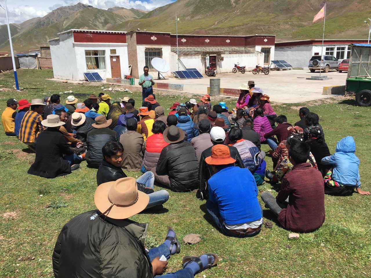 圖為(wei) 中國人壽西藏分公司駐村工作隊員向村民宣講最新的涉農(nong) 、涉牧保險知識。