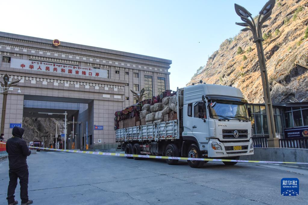 裝有尼泊爾貨物的貨車駛入吉隆口岸國門(12月28日攝)。