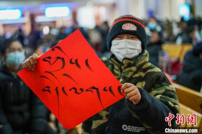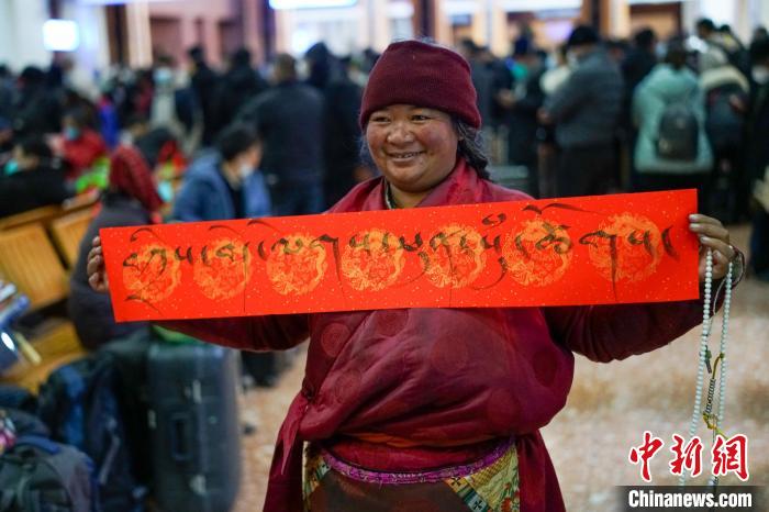 圖為(wei) 春運首日,拉薩火車站一旅客獲得車站送的藏式春聯,上麵書(shu) 寫(xie) 的是藏語“紮西德勒 吉祥如意”。 江飛波 攝