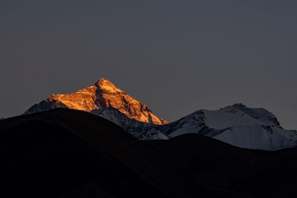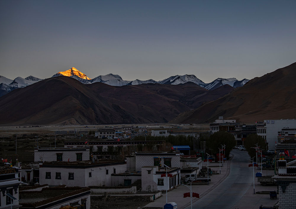 落日餘(yu) 暉灑在珠峰上,紮西宗鄉(xiang) 慢慢沉睡(2022年5月10日攝)。