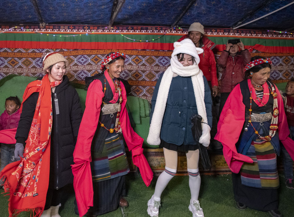 巴鬆村的群眾(zhong) 和遊客一起跳鍋莊舞迎新春(2020年1月20日攝)。