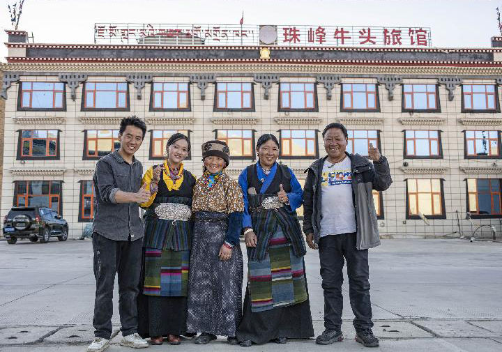 多吉一家在新開業(ye) 的牛頭旅館前合影留念(2022年5月10日攝)。