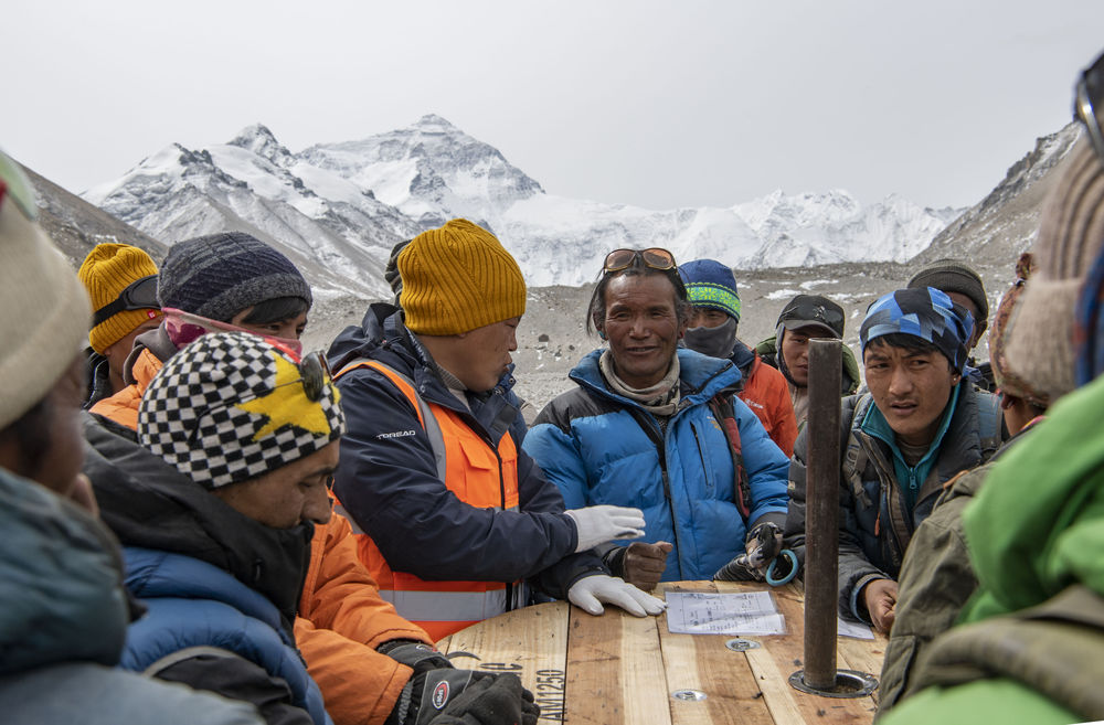 格桑(中間穿藍色羽絨服者)和其他村民一起商議將光纖運送到海拔6500米前進營地的方法(2020年4月15日攝)。2020珠峰高程測量期間,為(wei) 保障峰頂信號質量,網絡運營商需要將光纖鋪設至海拔6500米的珠峰前進營地。格桑和其他村民一起,承擔起運輸光纖的任務。