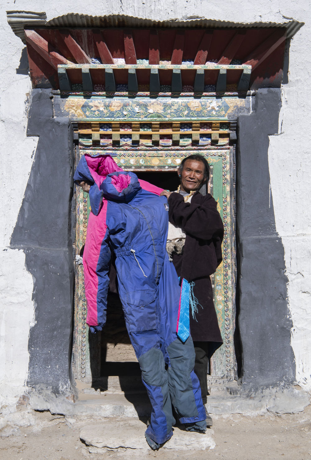 格桑在展示自己登頂時穿過的連體(ti) 羽絨服(2020年1月22日攝)。
