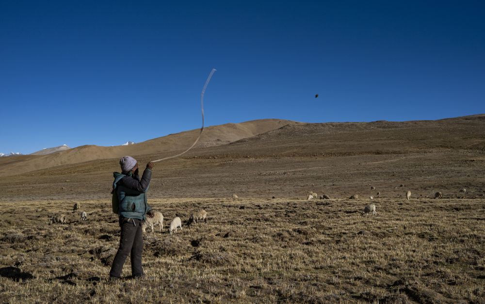 藏普村的牧民揮舞著“古爾朵”驅趕羊群(2022年5月13日攝)。