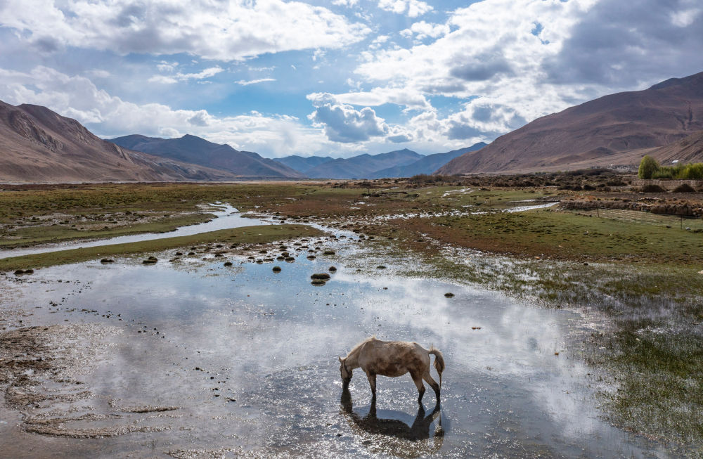 天氣轉暖,珠峰腳下顯露出一抹綠色。流經紮西宗鄉(xiang) 的紮嘎曲河,綠樹吐出新芽,馬兒(er) 在濕地裏悠閑吃草。