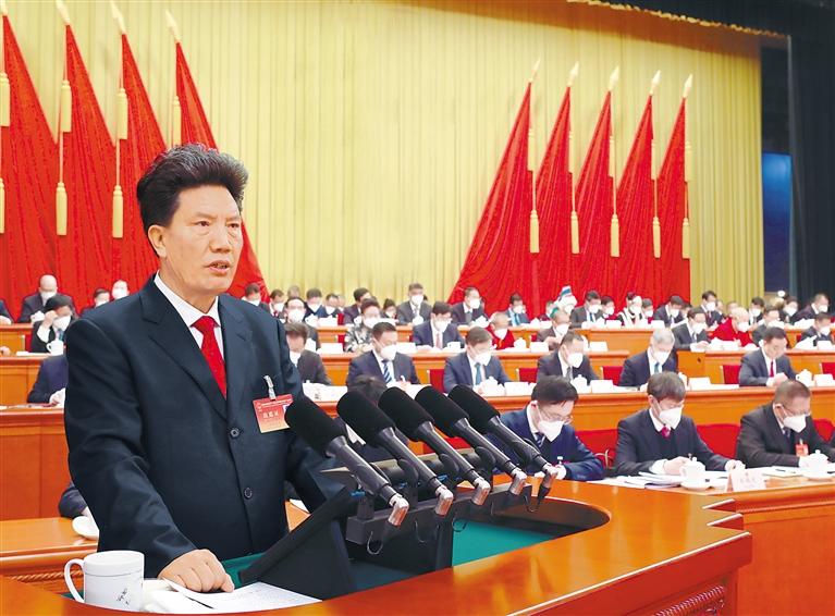 1月14日上午,自治區第十二屆人民代表大會(hui) 第一次會(hui) 議舉(ju) 行第二次全體(ti) 會(hui) 議。洛桑江村向大會(hui) 作自治區人大常委會(hui) 工作報告。 記者 唐斌 攝