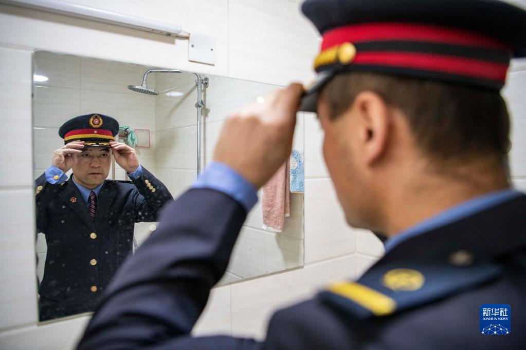 在拉薩機輛整備中心的宿舍裏,黃起崗整理自己的著裝(1月11日攝)。