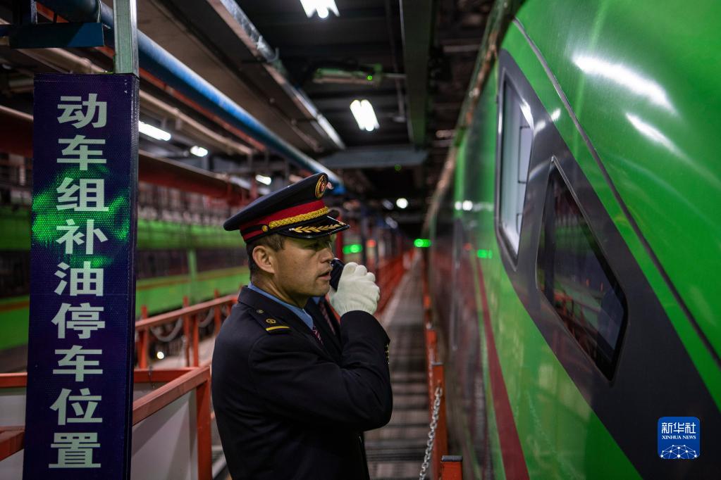 在拉薩機輛整備中心,黃起崗在和一體(ti) 化調度中心確認動車組補油位置(1月11日攝)。新華社記者 孫非 攝