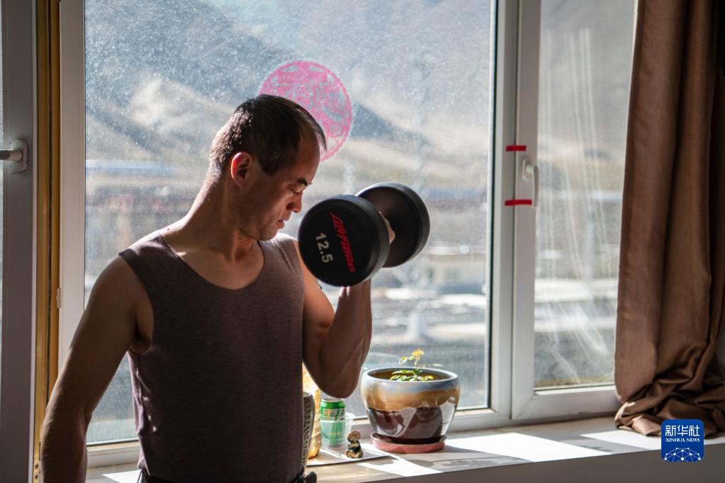 在拉薩機輛整備中心的宿舍裏,黃起崗利用空閑時間鍛煉身體(ti) (1月11日攝)。新華社記者 孫非 攝