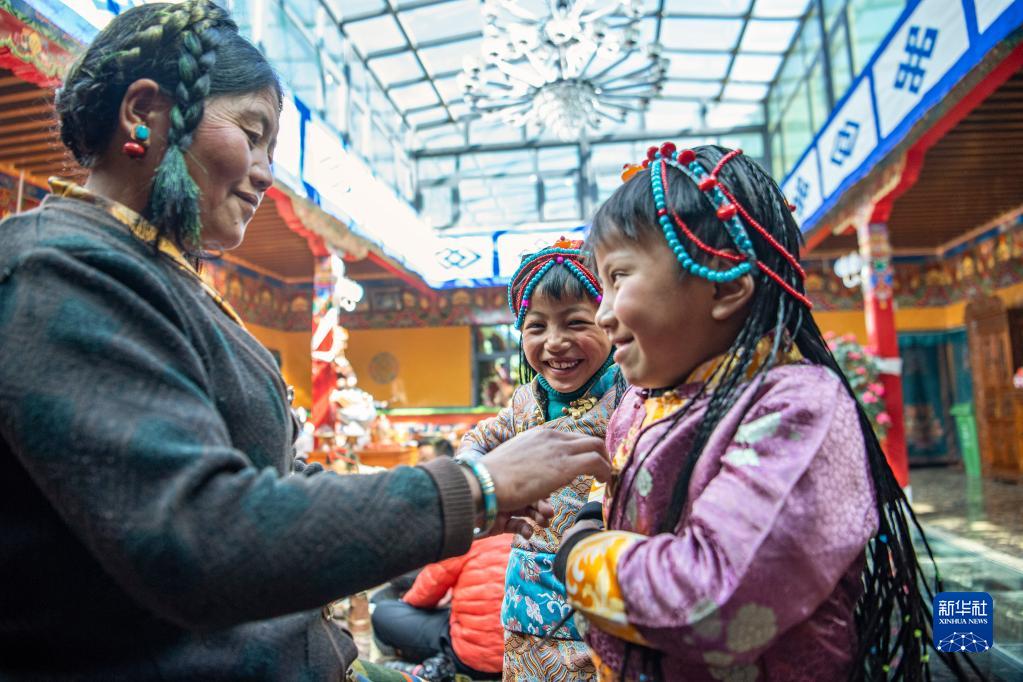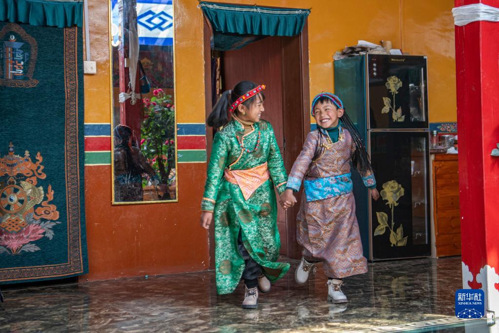 今年,日喀則藏曆農(nong) 家年和春節“巧遇”同一天,雖習(xi) 俗不同,但年味皆濃。次旦的兒(er) 孫早早開車去縣城采買(mai) 了年貨,兒(er) 媳婦們(men) 在家準備過年吃的羊頭、切瑪等傳(chuan) 統特色美食。家中的第四代,次旦老人的重孫子和重孫女們(men) ,則穿上了漂亮的藏裝,頭戴綠鬆石點綴的頭飾,在家中歡快地跑來跑去。