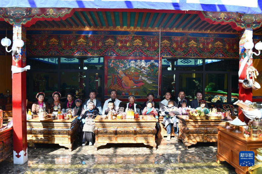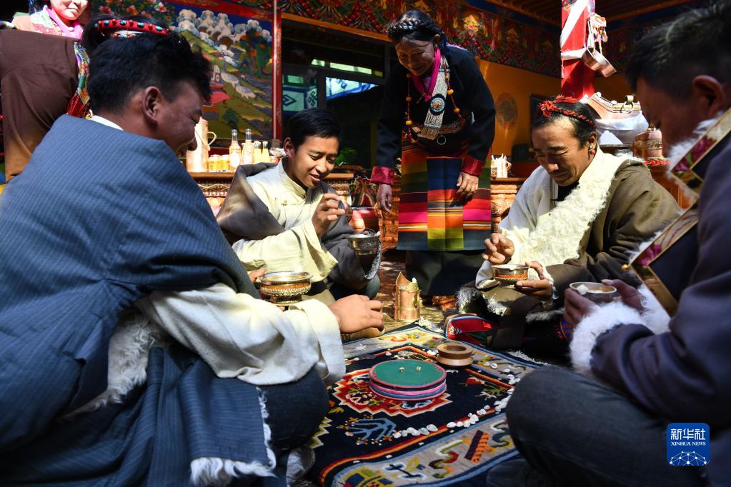 在位於(yu) 西藏日喀則拉孜縣紮西宗鄉(xiang) 雜村的家中,次旦老人一臉幸福的微笑,家中小輩正輪流上前和她行碰頭禮。