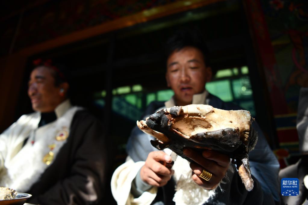 次旦老人孫子在吃過年必吃的傳(chuan) 統特色美食羊頭(1月22日攝)。新華社記者 晉美多吉 攝