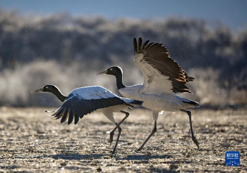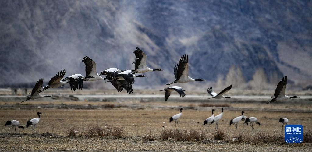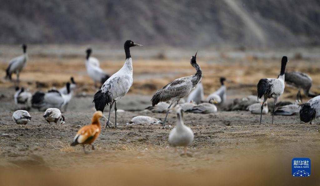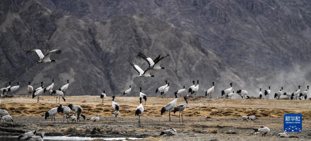 在西藏雅魯藏布江中遊河穀黑頸鶴國家級自然保護區日喀則片區拉孜縣附近,大量越冬的黑頸鶴翩翩起舞,迎接春天的到來。