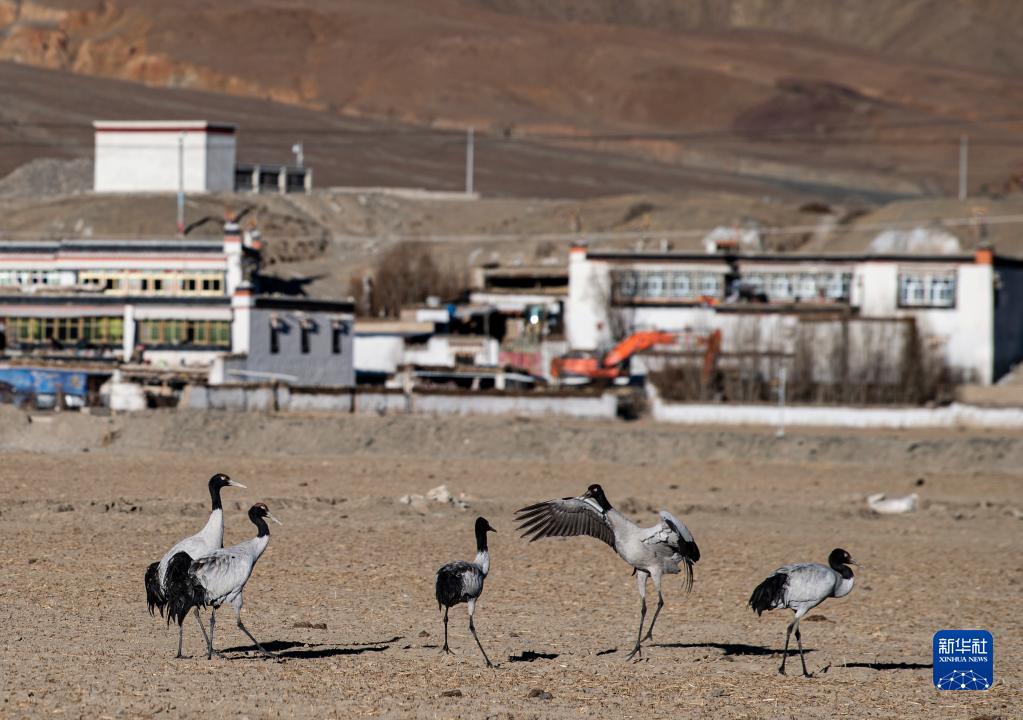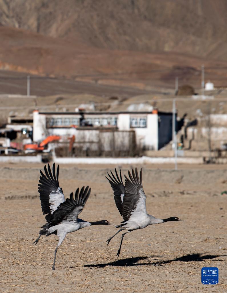 在西藏雅魯藏布江中遊河穀拉孜縣農(nong) 區越冬的黑頸鶴(1月23日攝)。新華社記者 孫非 攝