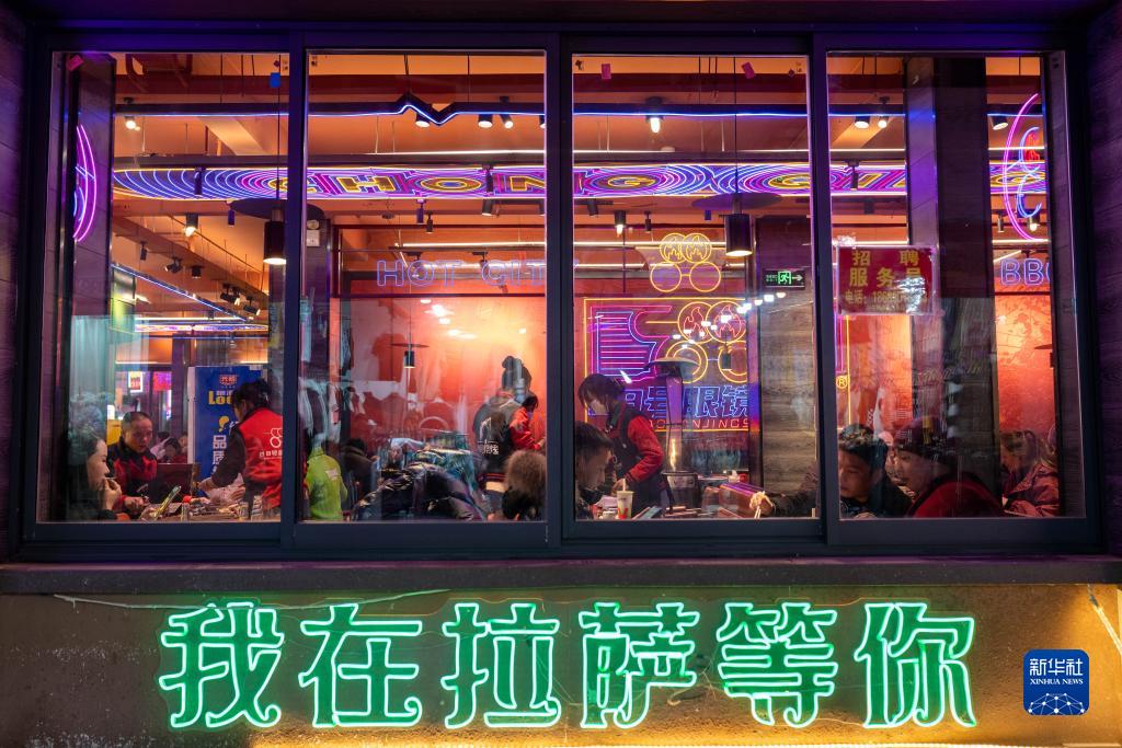 夜幕降臨(lin) ,拉薩西郊的天海夜市亮起華燈,食客們(men) 陸續進入燒烤區內(nei) ,各家店鋪如往常一樣在烤架上擺好肉串,飄香的煙霧讓晚間的夜市光影朦朧。