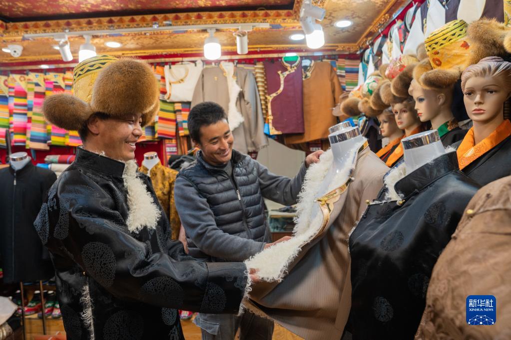 在八廓街周邊的老城區,顧客在挑選藏裝(1月11日攝)。新華社記者周荻瀟 攝