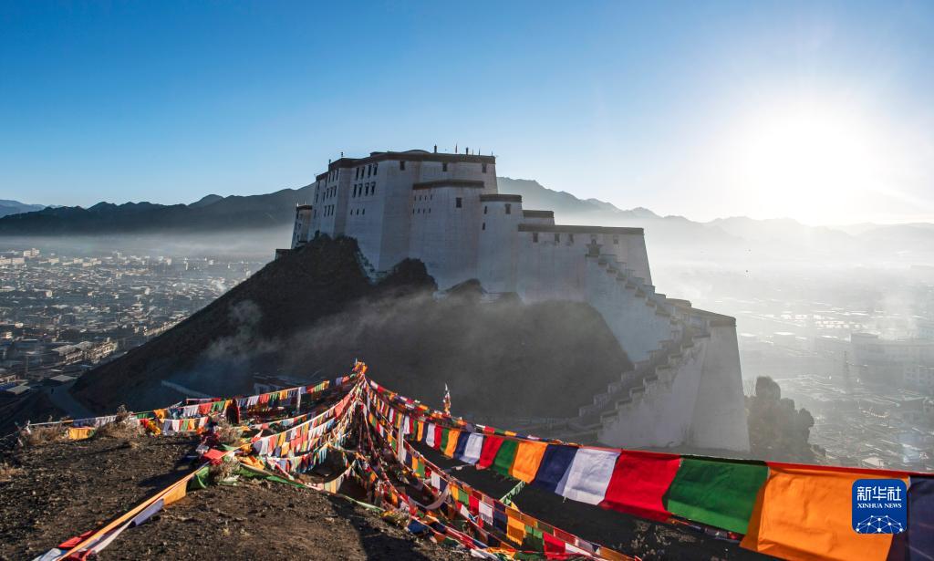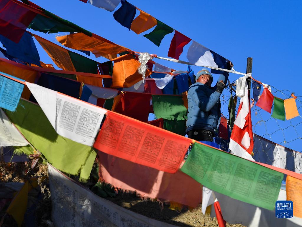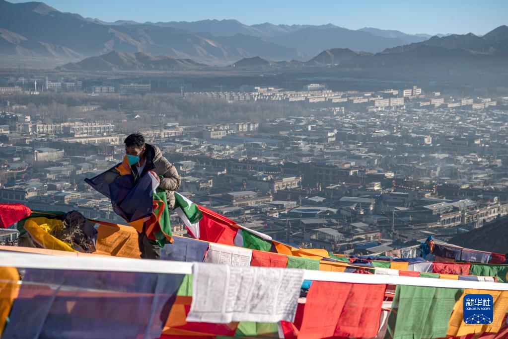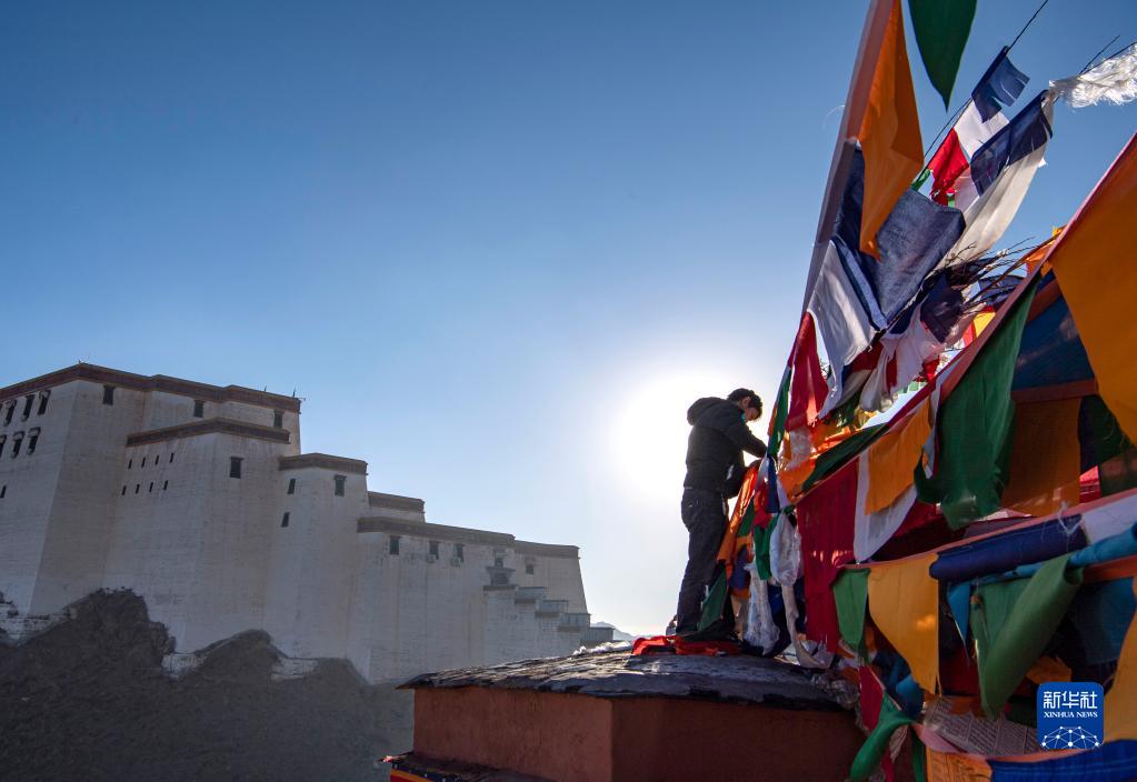 1月24日,日喀則市桑珠孜區的藏族群眾(zhong) 在懸掛五彩經幡。新華社記者 晉美多吉 攝