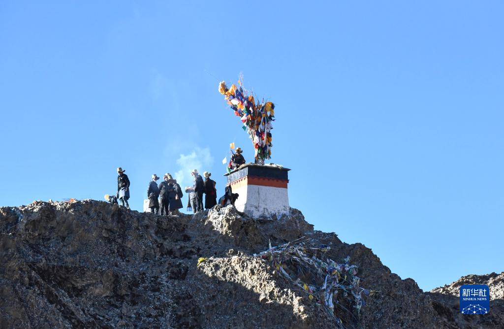 1月23日,西藏拉孜縣曲瑪鄉(xiang) 的藏族群眾(zhong) 在山上豎起五彩經幡。新華社記者 晉美多吉 攝