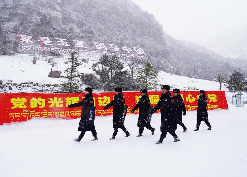 圖為(wei) 玉麥邊境派出所移民管理警察在大雪中執行巡邏任務。蔣兵攝