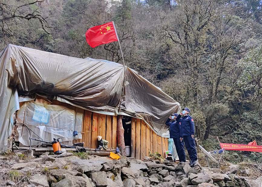 圖為(wei) 春節前夕,拉郊邊境派出所移民管理警察王彥凱(左一)與(yu) 同事為(wei) 執勤點更換新國旗後,向國旗敬禮。伊比熱恨攝