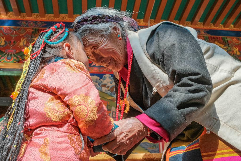 今年,西藏農(nong) 家年和春節“巧遇”同一天,習(xi) 俗雖不同,但年味皆濃。從(cong) 縣城買(mai) 來的年貨,一家人製作的切瑪和卡塞(油炸麵食)等傳(chuan) 統供品和食品,紛紛擺上了桌。第四代的孩子們(men) ,也換上了嶄新的藏裝,頭戴綠鬆石點綴的頭飾,依偎在祖奶奶次旦的身旁。