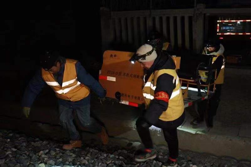 “大家帶好工具材料,準備出發。”22時整,隨著作業(ye) 負責人探傷(shang) 工區工長羅布一聲令下,呼嘯的寒風中,黃色的“迷你敞篷車”緩緩啟動,載著4名職工,開始了當晚對拉林鐵路20多公裏線路的探傷(shang) 檢查任務。
