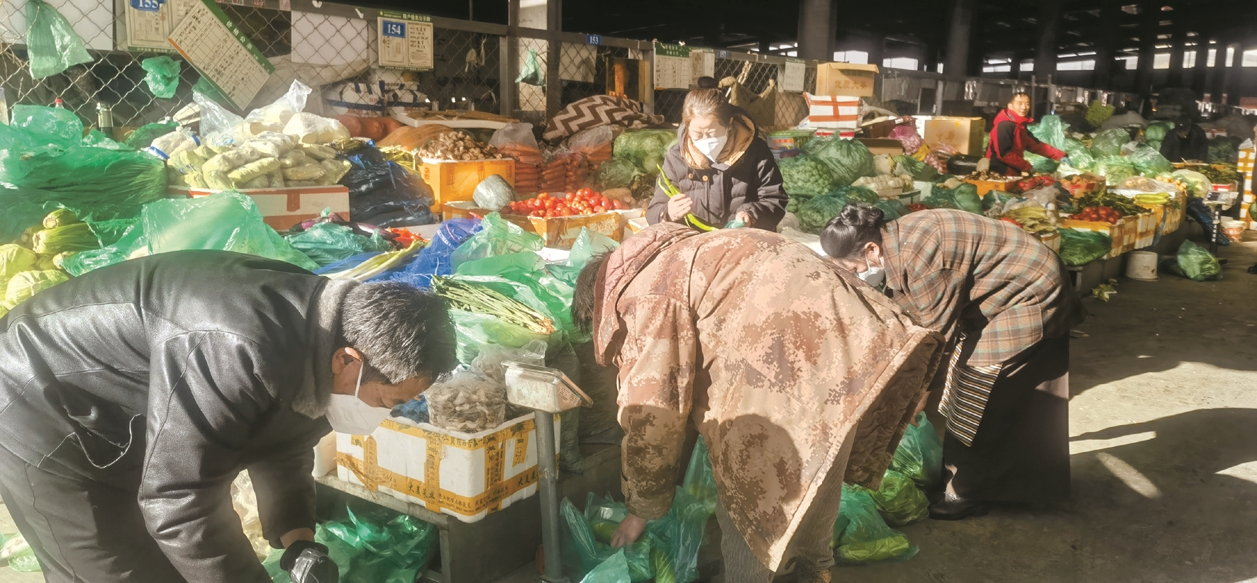 圖為(wei) 在拉薩東(dong) 嘎農(nong) 副產(chan) 品批發市場蔬菜銷售區,市民在購買(mai) 蔬菜。拉薩融媒記者 楊 璐攝