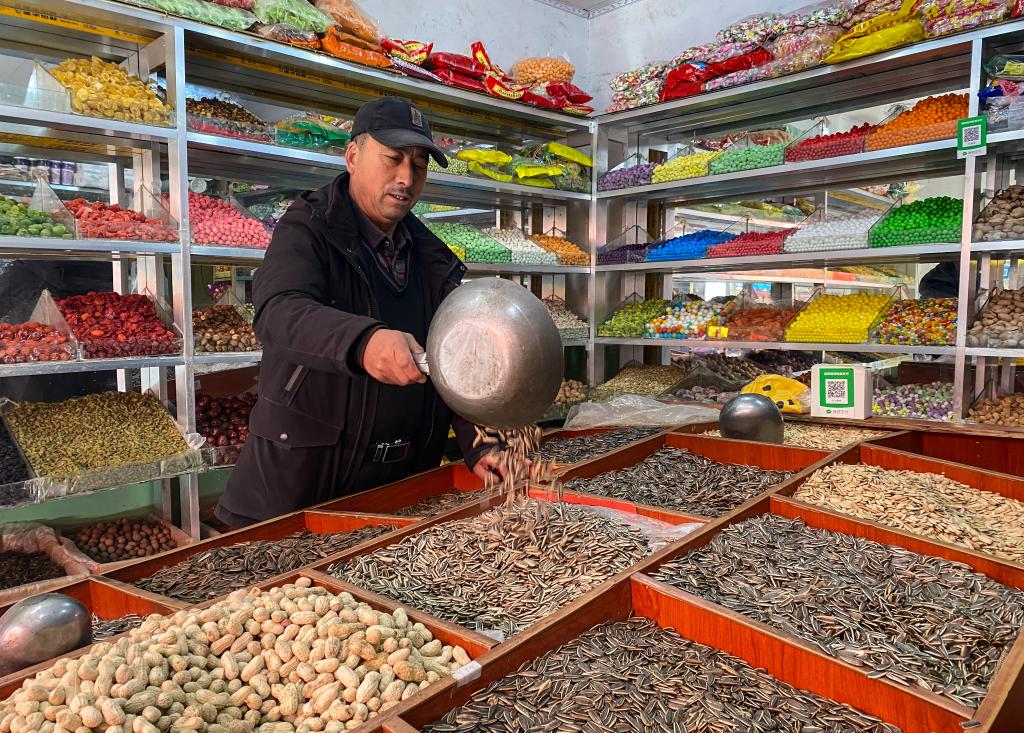 2月1日,王西木售賣幹果和各色糖果。新華社記者春拉 攝