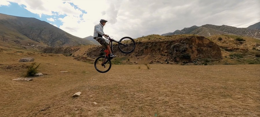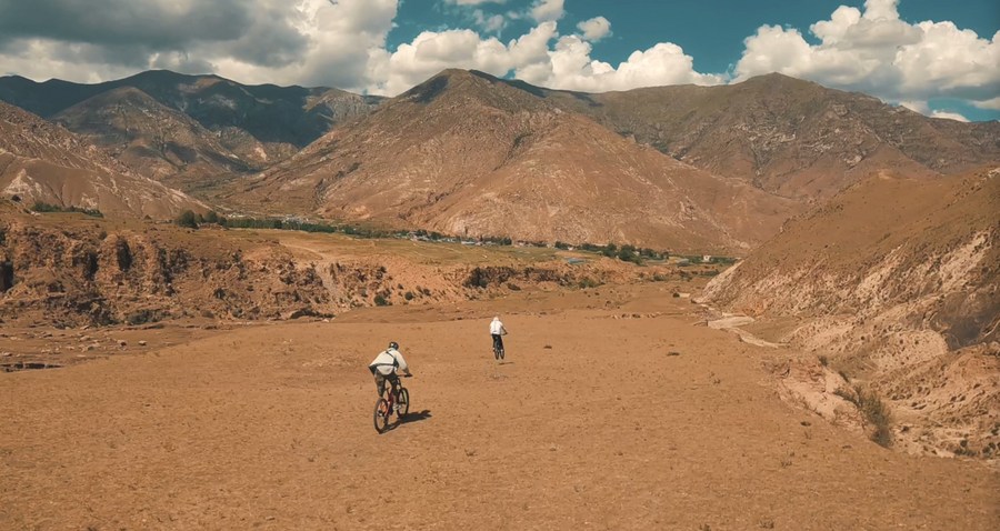 乘著風,沿著山脊速降,自行車始終徘徊在失控邊緣,旦增吉米需要不斷調整、控製。