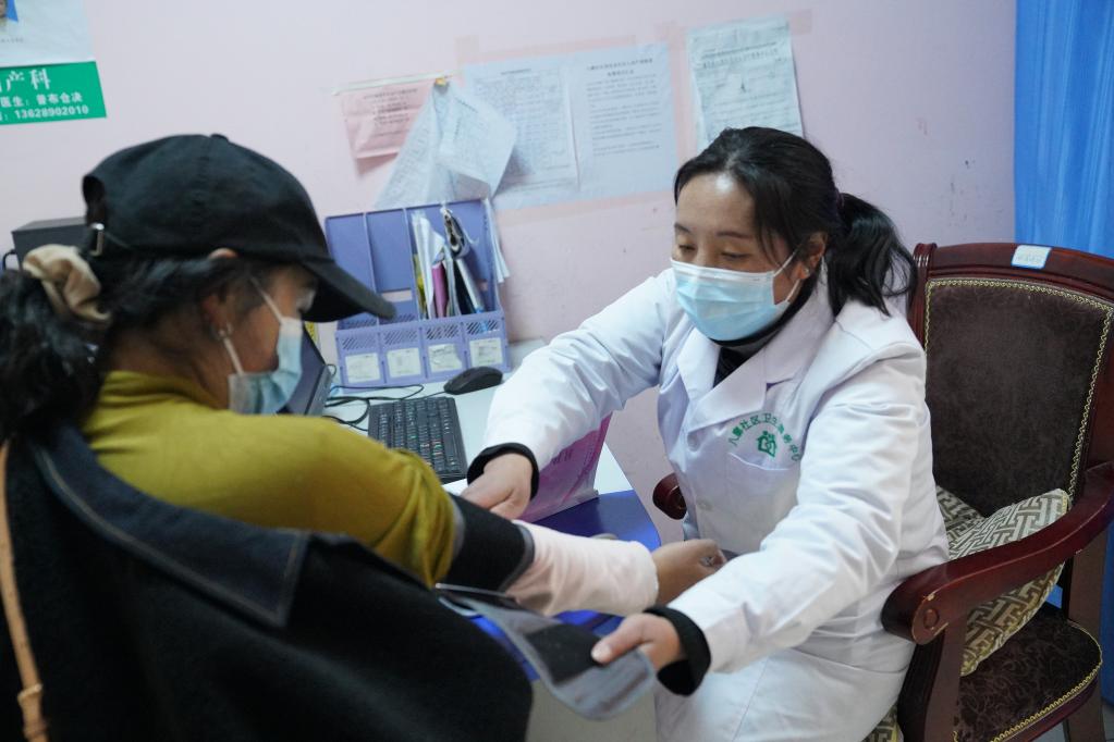 醫生為(wei) 拉薩市八廓街道居民次仁卓瑪(右)測量血壓。新華社記者黃耀漫 攝