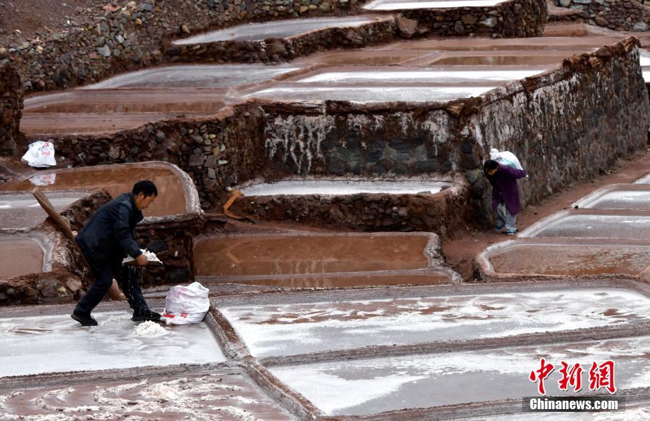 2月13日,西藏昌都芒康縣納西民族鄉(xiang) 加達村村民正在鹽田勞作。