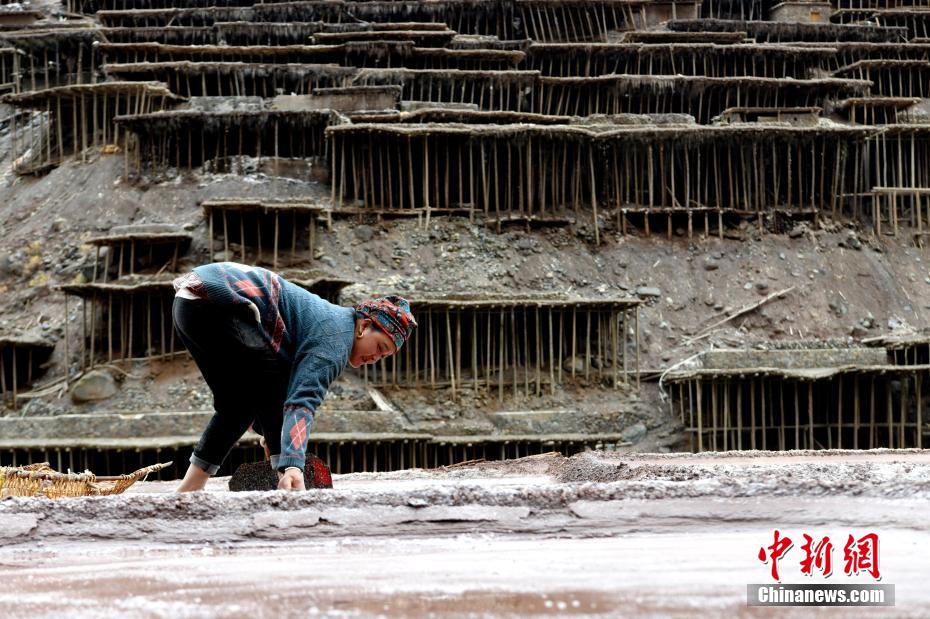 2月13日,西藏昌都芒康縣納西民族鄉(xiang) 加達村村民珍羅正在掃鹽。