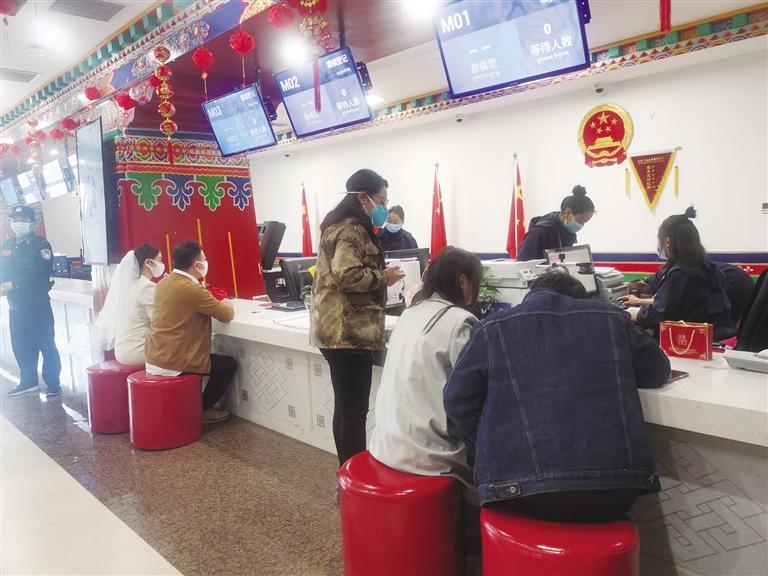 14日一大早,記者在拉薩三級政務服務大廳婚姻登記處看到,大廳裏坐滿了前來登記領證的情侶(lv) ,工作人員正在有序地為(wei) 新人辦理證件。記者注意到,前來登記領證的新人或手捧鮮花,或頭戴白紗,或好友一路跟拍,臉上洋溢著幸福的笑容。為(wei) 了營造浪漫的節日氛圍,婚姻登記處的工作人員也在大廳和禮堂內(nei) 精心擺放了寓意為(wei) “百年好合”的百合花。