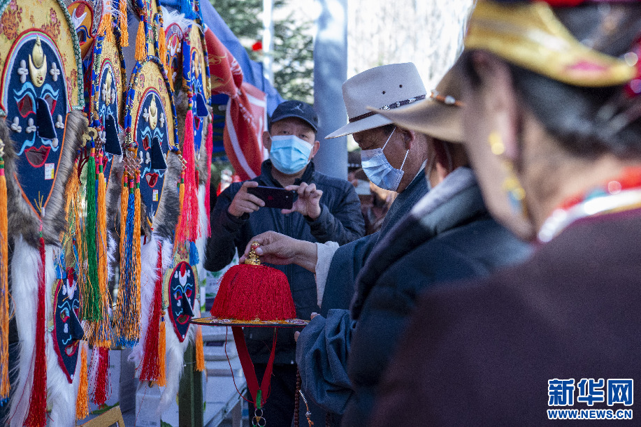 2月14日,群眾(zhong) 在阿古傳(chuan) 統藏戲服飾農(nong) 牧民專(zhuan) 業(ye) 合作社展位上挑選傳(chuan) 統藏戲服飾。新華網 旦增努布 攝