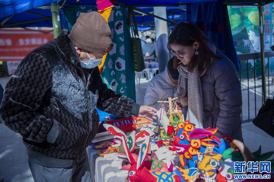 2月14日,群眾(zhong) 在直孔朗霞傳(chuan) 統針織加工專(zhuan) 業(ye) 合作社展位上挑選由傳(chuan) 統針織技藝製作的年貨。新華網 旦增努布 攝
