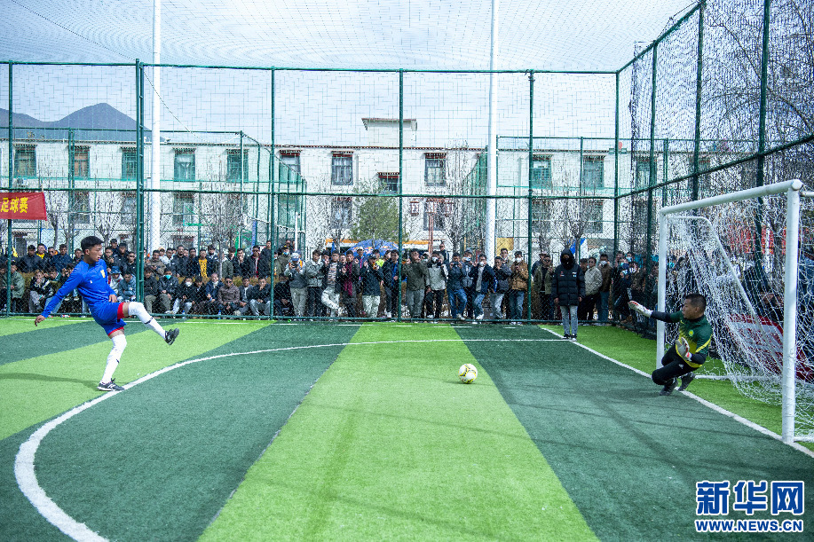 2月14日,巔炯邁瓦隊球員西繞加措在門前抽射。 新華網 旦增努布 攝