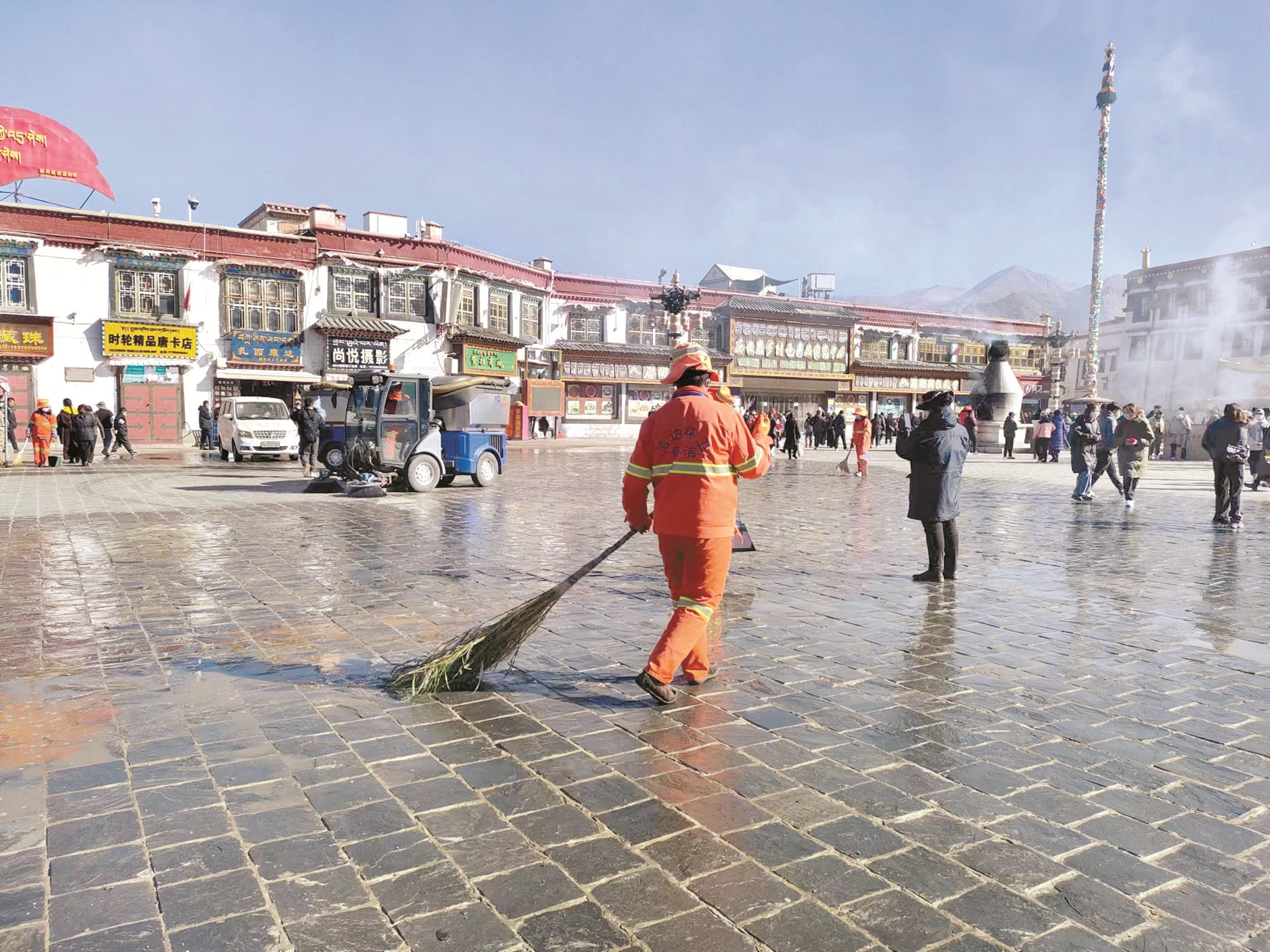 “今天,針對大昭寺廣場衛生整治,我們(men) 一共出動了20餘(yu) 名保潔人員,還有一台小高壓衝(chong) 洗車和兩(liang) 台小型機掃車。通過人機結合的方式,對廣場進行徹底的衛生大掃除,希望在藏曆新年期間,為(wei) 市民營造一個(ge) 良好的衛生環境。”西藏博瑞環衛服務有限公司督察員強巴偉(wei) 色介紹說。