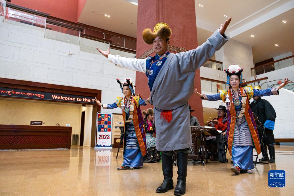 2月22日,在西藏博物館,“堆諧”舞蹈演員向觀眾(zhong) 謝幕。新華社發(丁增尼達 攝)