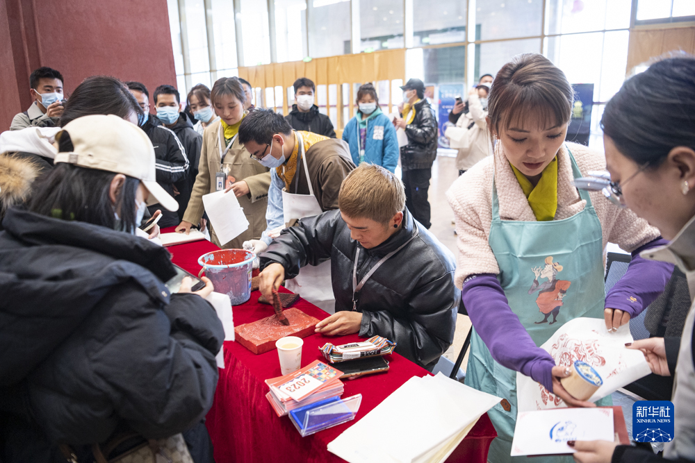 2月22日,西藏博物館工作人員為(wei) 遊客製作帶有“吉祥八寶”“紮西德勒”等圖案和文字的木刻印刷品。新華社記者 孫非 攝
